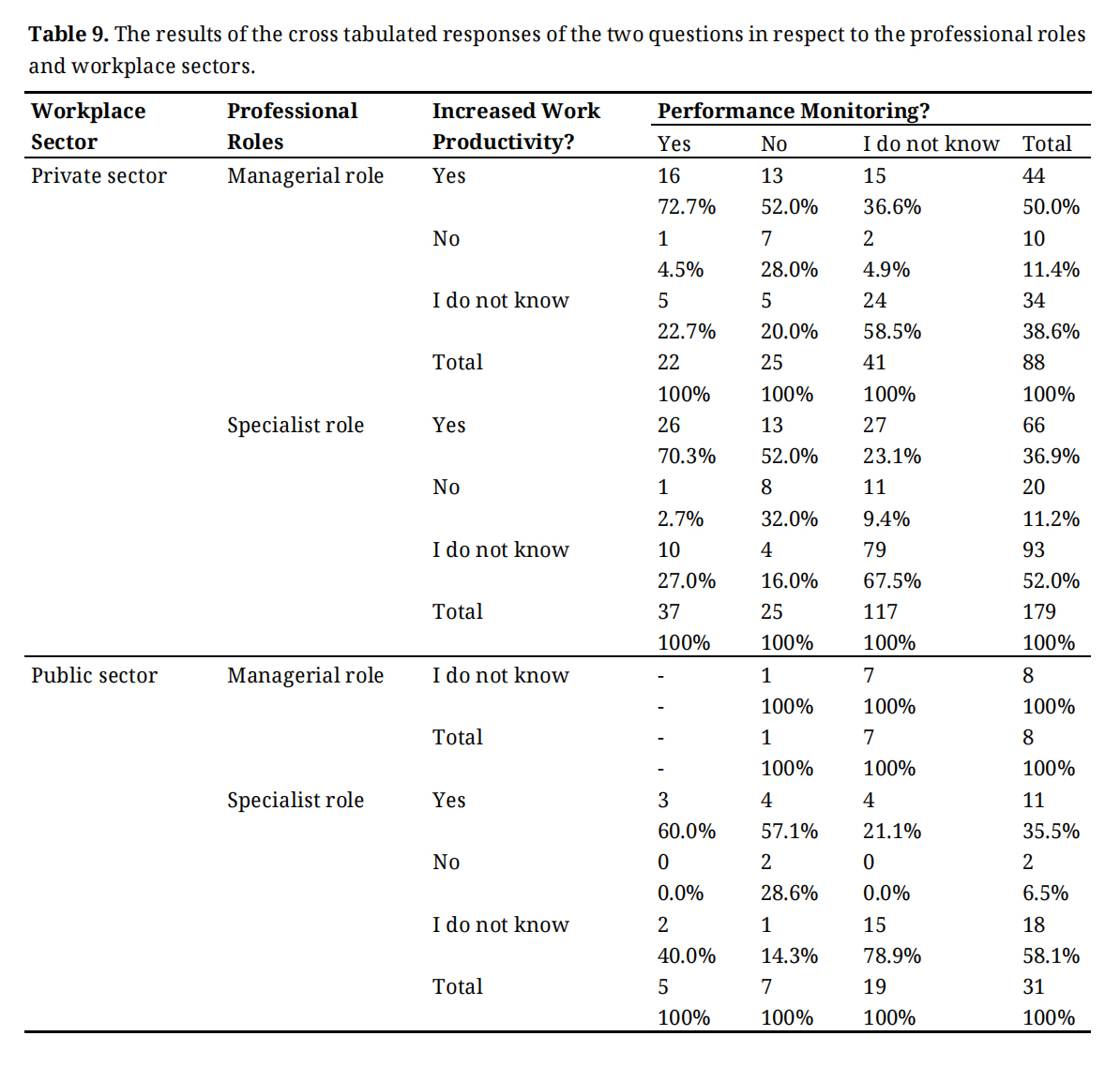 Adding the workplace sector revealed further differences as shown on Table 9: for instance, awareness in managerial roles appears as opposite as the number of both “Yes” and “No” answers to the increased productivity by the public sector managers are lacking, which is underlined as the managers in the private sector recognized the increased productivity with 50.0% “Yes” answers under Total column. Also, the disparity is highlighted as the specialists in the public sector responded with “Yes” and “No” answers on increased productivity. Based on these findings, it seems that the managers in the private sector are mostly informed or aware about the increased productivity, also in respect to the specialists in both sectors, while managers in the public sector are not aware of productivity development or performance monitoring of IT in workplaces.