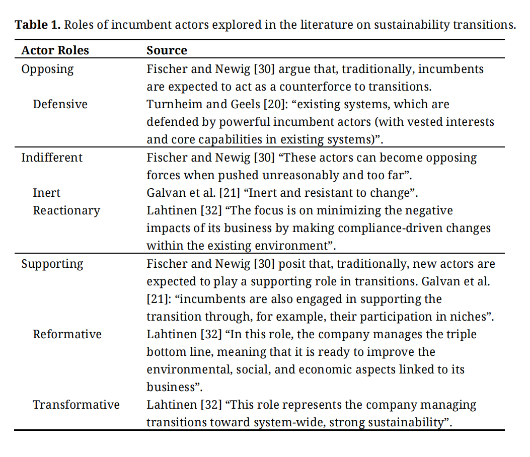 Recent studies pay attention to the supporting role of incumbent actors in transitions [6,15,19–21] in addition to their defensive role in transitions. Fischer and Newig [30] distinguish between an opposing, an indifferent and a supporting role for actors in transitions. Galvan et al. [21] distinguish actor roles between inert, resistant to change and supportive of transitions. According to Lahtinen [32], an incumbent actor can act to contribute to transitions through a reactionary, reformative or transformative role. The actor roles explored in these studies are presented in