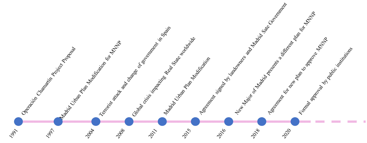 Initial setupThe MNNP, originally conceived as Operation Chamartín, had its inception in the 1990s [80] as a comprehensive urban redevelopment initiative cantered around the railway station of Chamartín, at the north of Madrid’s downtown and its adjacent neighbourhoods in Madrid, Spain [79]. The initial ‘Operation Chamartín’ was conceived in 1991 by the then Prime Minister, Felipe González, accompanied by Joaquín Leguina, the President of the Community of Madrid, and Agustín Rodríguez Sahagún, the mayor of the capital. The project did not officially start until two years later when Renfe, the train operation public monopoly that operated in Spain at that time belonging to the Ministry of Development, led by Josep Borrell, awarded Argentaria (today known as BBVA Bank—Banco Bilbao Vizcaya Argentaria S.A) the urban development of Operation Chamartín. For 15 years, the former landowners, expropriated by the State for the construction of the railway, fought in court to reclaim their lands decided to change its use. However, in 2012, the Supreme Court confirmed that the reversal of the territories was not appropriate as they were not disaffected from the purpose for which they were expropriated.