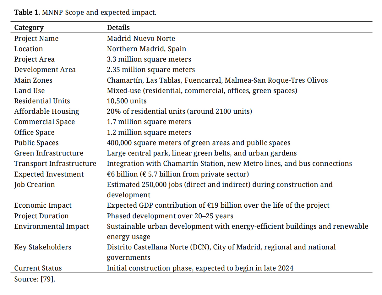 The Madrid Nuevo Norte Project (MNNP) is representing one of the largest urban regeneration projects in Europe that receives recently extensive research interest [1–4]. The MNNP is a large-scale urban development initiative in Madrid, Spain, aimed at transforming the degraded area of the city’s northern district into a sustainable and modern urban area that is classified as mega-project [5]. The project is expected to contribute to the local economic development of Madrid, as well as provide social benefits such as the provision of basic civil facilities, positive visual impact, enhanced transportation efficiency and mobility, etc. The MNNP is a public-private partnership (PPP) model, reflecting the collaborative efforts of the public and private sectors in overcoming challenges and driving the project forward [6]. The execution status and the benefits of conducting a case study on the MNNP are essential considerations for understanding the complexities and implications of large-scale urban development projects.