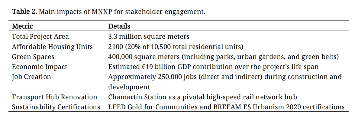 The scope of MNNP encompasses the creation of new public spaces, green areas, and civic facilities [76,77], with an emphasis on fostering social interaction and community engagement. Approximately 76% of the total area is designated for public use, reflecting a commitment to enhancing the quality of life for residents and ensuring accessibility to essential services. The project aims to address critical urban challenges, such as the regeneration of degraded urban areas, the promotion of sustainable transportation options, and the integration of green infrastructure to mitigate environmental impacts. Moreover, MNNP is positioned as a catalyst for economic development, with the potential to attract foreign investment and stimulate local job creation. The mega-projects are planned to facilitate the implementation of Madrid city marketing and image strategies that enhance Madrid’s competitiveness on a global scale. However, the realization of MNNP’s objectives is contingent upon navigating a complex landscape of political, social, and environmental considerations [78]. The project has faced scrutiny regarding its potential social impacts, including concerns about gentrification and the preservation of local cultural heritage, as well as sustainability impacts, such as green urban areas, regeneration of degraded areas and removal of old industries (Table 1).