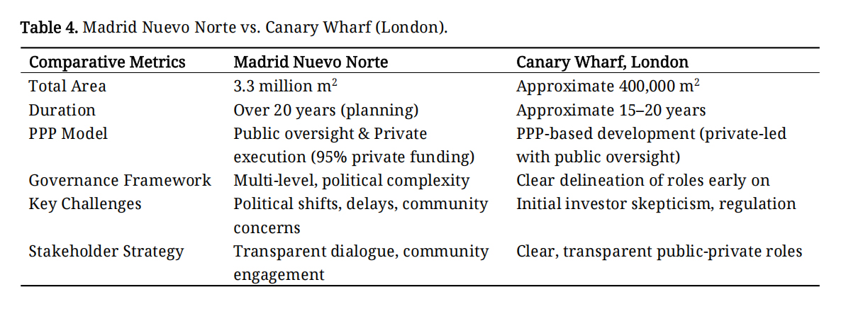Practical Implications: Replicable Strategies and BenchmarkingTo strengthen the practical contribution of this case study, we propose the following replicable strategies derived from the Madrid Nuevo Norte Project, benchmarked against London’s Canary Wharf urban regeneration initiative to underscore transferable lessons for urban megaproject management: