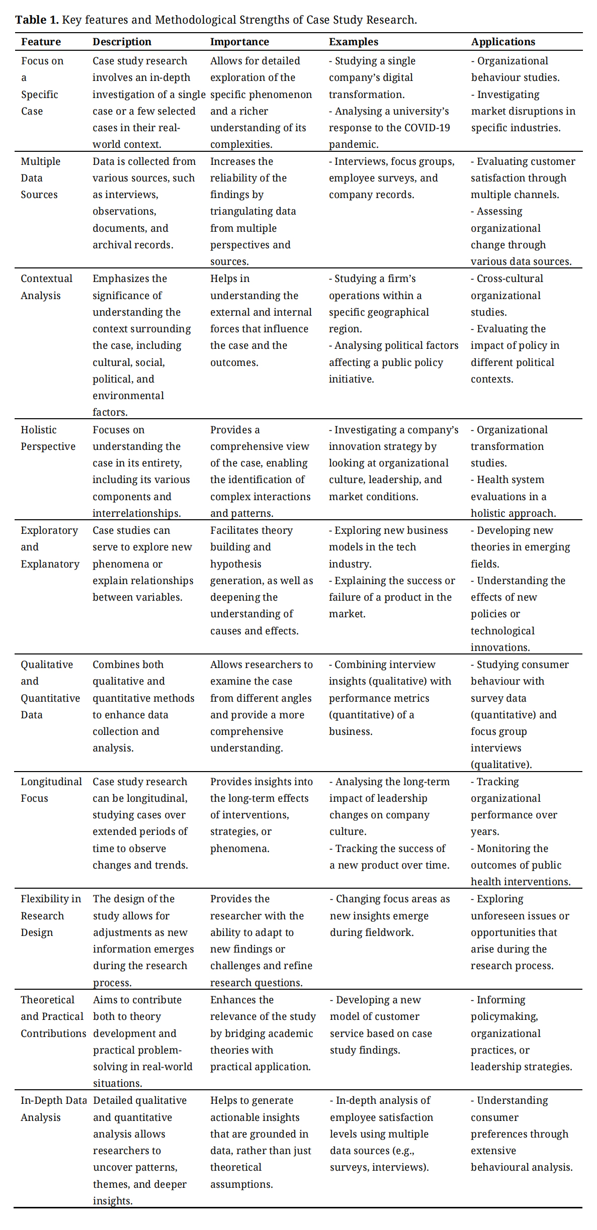 Core Characteristics and Methodological StrengthsTable 1 outlines the key features of case study research, which is a qualitative research method used to investigate complex phenomena within their real-life contexts. These features reinforce the methodological rigour of case study research, demonstrating its ability to integrate qualitative and quantitative methods while maintaining a holistic and contextual focus. The ability to combine multiple data sources, apply flexible research designs, and engage in longitudinal analysis highlights the adaptability and robustness of case study research.