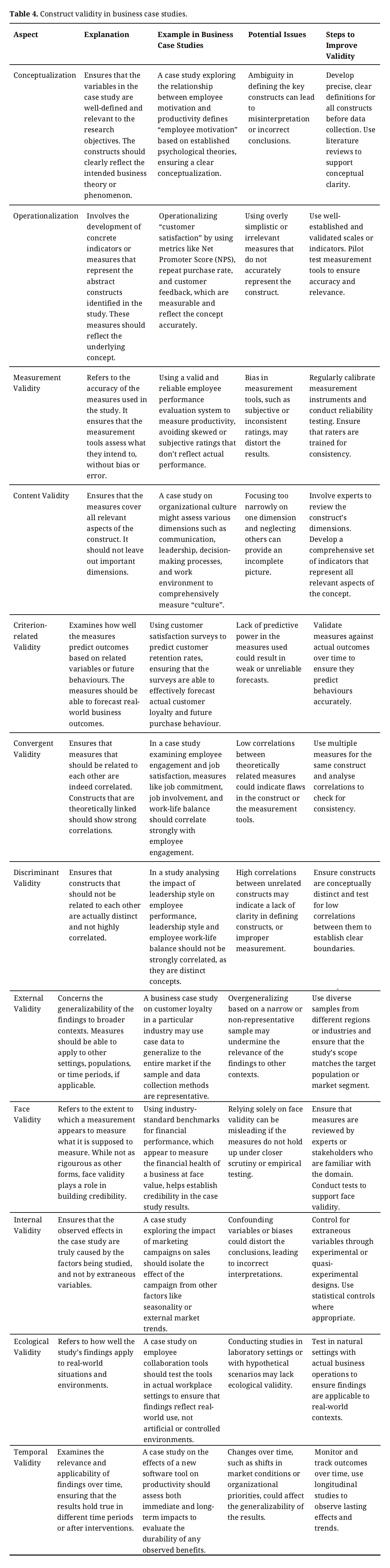 Table 4 provides an in-depth look at construct validity within business case studies. Construct validity refers to how accurately a measurement or test represents the concept it is intended to measure. In business case studies, it is essential to ensure that variables, measures, and conclusions align with the business theories or phenomena being studied. The table outlines several critical aspects of construct validity, such as conceptualization, operationalization, measurement validity, and others, each explained with examples, potential issues, and steps to improve the validity.