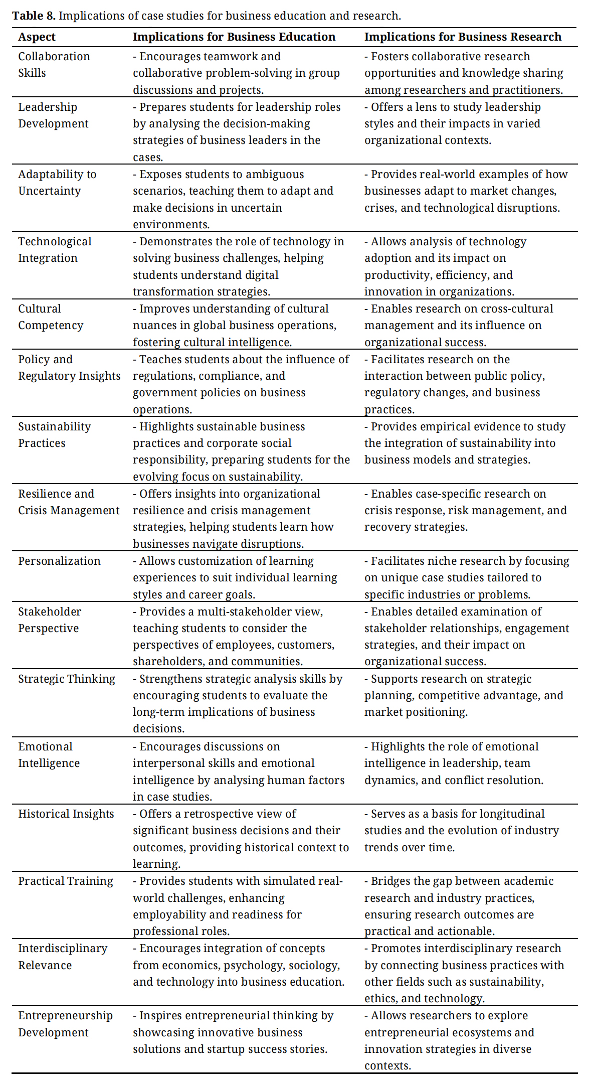 Table 8 highlights the key implications of case studies for both business education and research. In education, case studies develop critical skills like collaboration, leadership, and strategic thinking, helping students navigate uncertainty and adapt to changing environments. They also enhance cultural competency, policy awareness, and sustainability understanding. In research, case studies offer insights into leadership, crisis management, and stakeholder perspectives, providing empirical evidence across diverse organizational settings. Both fields benefit from case studies’ focus on emotional intelligence, historical context, and practical application, bridging theory and practice. Additionally, case studies promote interdisciplinary learning and entrepreneurship development, encouraging consideration of diverse factors in decision-making and innovation.