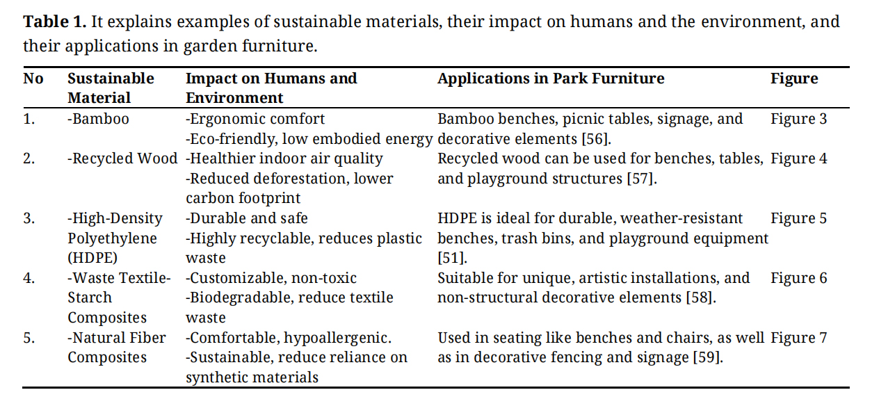 In this context, Şatıroğlu, E., et al. (2023) added to the efforts to achieve environmental balance for a sustainable future. Emphasis was placed on the importance of using sustainable materials, such as those that consume less energy and are less harmful to the environment, nature, and human health. Sustainable urban furniture can contribute to the future by reducing environmental problems. In this study, urban furniture, such as seating elements, lighting elements, trash bins, paving materials, playgrounds, and pergolas in newly constructed or renovated green areas in central Rize over the past five years, was examined in the context of sustainable materials. These criteria included durability/maintenance, performance, functionality, recyclability, aesthetics, and environmental friendliness. The results were evaluated, and assessments were made of the materials used in urban furniture to create ecological and sustainable environments ‏[12].