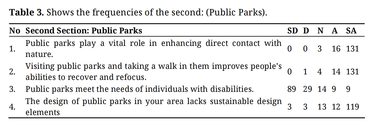 Public parks have greatly contributed to the process of cleaning the urban environment from carbon emissions and air pollution; they are very essential for people concerning their psychological and physical condition, especially in the city [25].