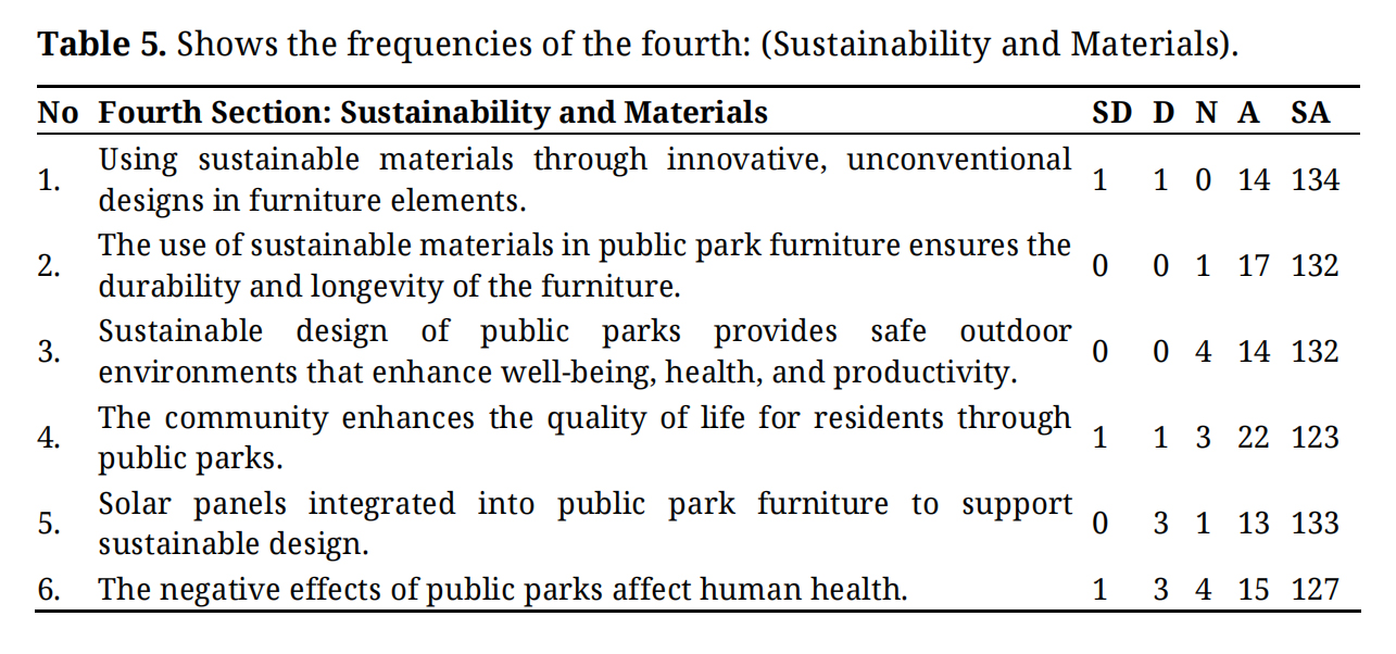 Description: The results of the responses of the sample about this part of an opinion poll which consists of 6 phrases about the Sustainability and Materials of public parks and Furniture design from the point of view of the respondents.