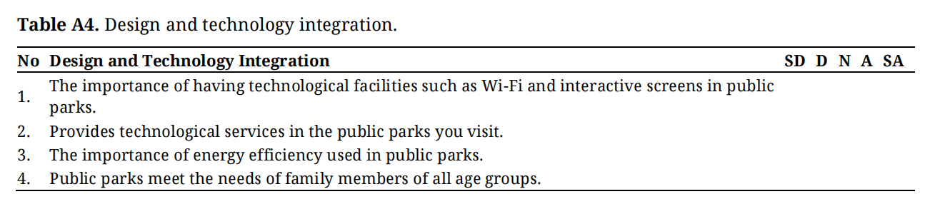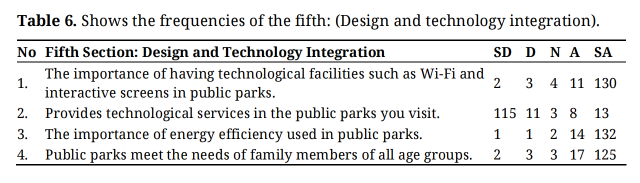 Description: The results of the responses of the sample about this part of an opinion poll, which consists of 4 phrases about Design and technology integration in public parks design from the point of view of the respondents.