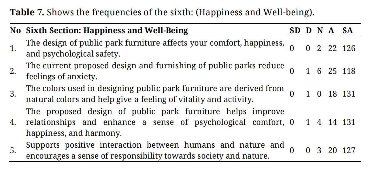Description: The results of the responses of the sample about this part of an opinion poll which consists of 5 phrases about Public garden furniture and its impact on achieving happiness, well-being, and psychological safety for visitors.