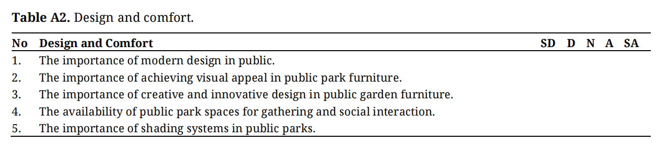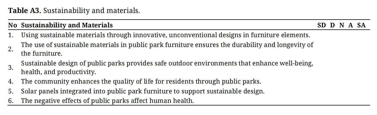 Data related to beneficiary responses to the survey were securely collected using a five-point Likert scale from 1 to 5. The data were then analyzed to reveal beneficiaries’ opinions, attitudes, and preferences toward the proposed sustainable public garden furniture designs.