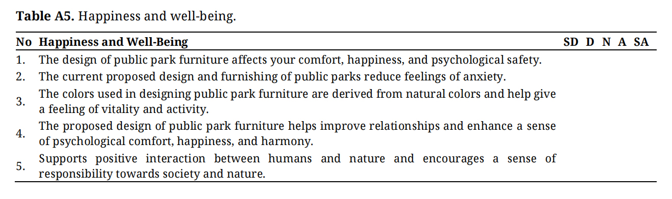 This approach is designed to close the knowledge gap on how sustainable, accessible, and energy-efficient urban furniture affects urban residents’ happiness and well-being, aiming to provide practical recommendations for sustainable public parks.