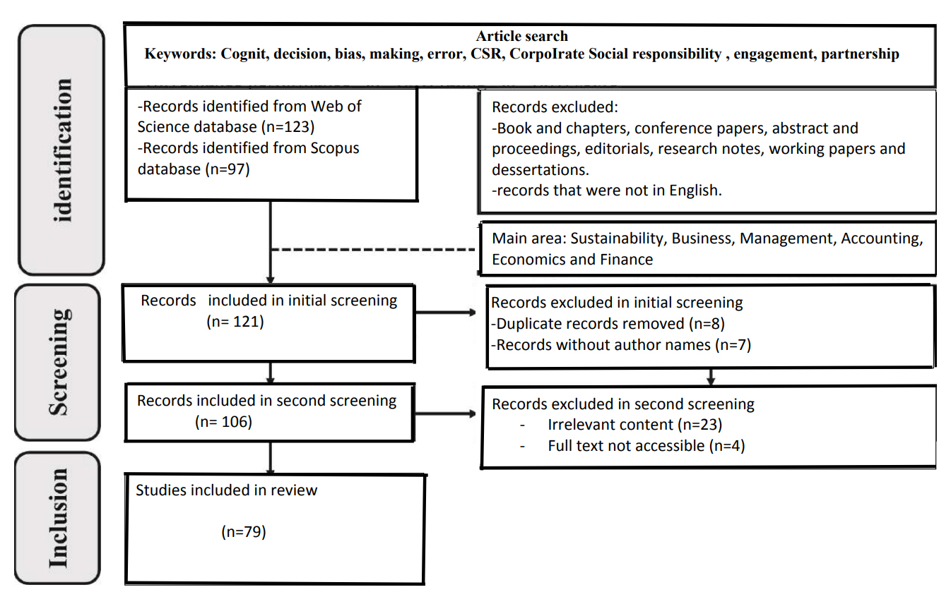 The search strategy was conducted using a combination of Boolean operators and keyword clustering to capture relevant literature on cognitive biases and CSR. Searches were performed across two major databases Scopus and Web of Science selected for their comprehensive coverage of peer-reviewed research in business, psychology, and interdisciplinary social sciences. The decision to use both databases aimed to ensure a broad yet rigorous collection of relevant literature.