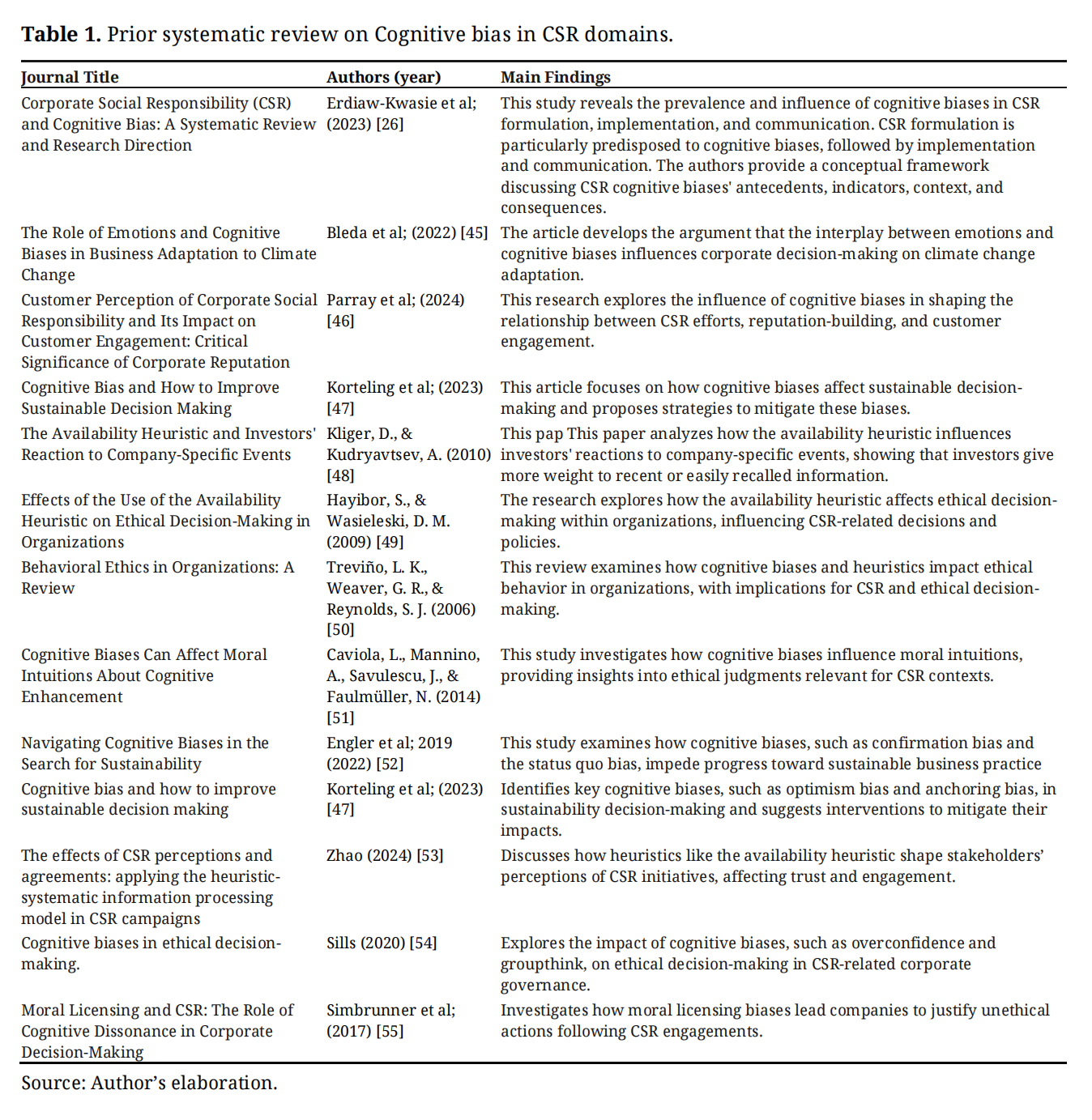 Table 1 summarizes prior systematic reviews on cognitive bias within the domain of corporate social responsibility (CSR).