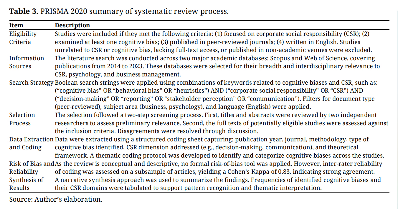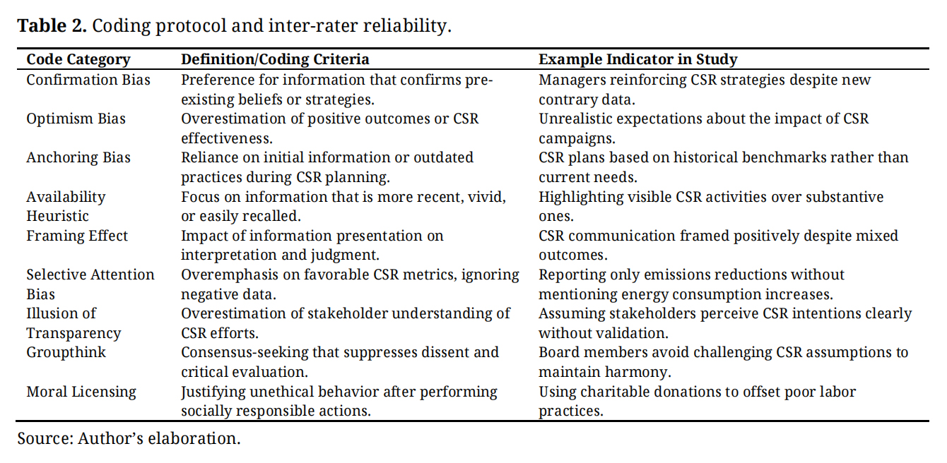 The following coding protocol was developed to systematically classify and analyze the studies included in the review. Each study was assessed for the type of cognitive bias identified, the corresponding CSR domain, and key indicators or cues that supported classification. The coding was conducted independently by two researchers, and inter-rater reliability was measured using Cohen’s Kappa, which yielded a value of 0.83, indicating strong agreement.