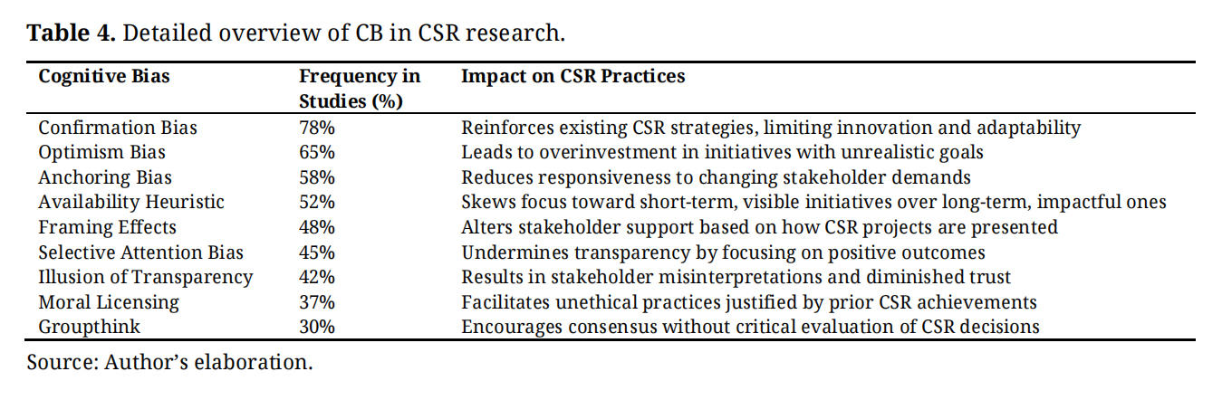 Cognitive biases shape CSR practices: The review identifies systematic patterns in how cognitive biases such as confirmation bias, framing effects, groupthink, and the availability heuristic influence decision-making, stakeholder perception, and CSR reporting.