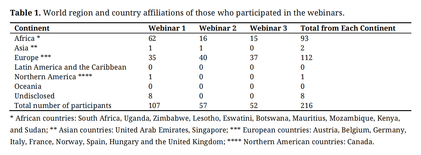 In total, 216 participants (see Table 1) contributed to the three webinars. Participants hailed predominantly from Europe and Africa, which can be attributed to the project’s geographic focus. The study received ethics clearance from the Ethics Committee of the Faculty of Education at the lead partner institution in the project and all participants provided informed consent to the study.