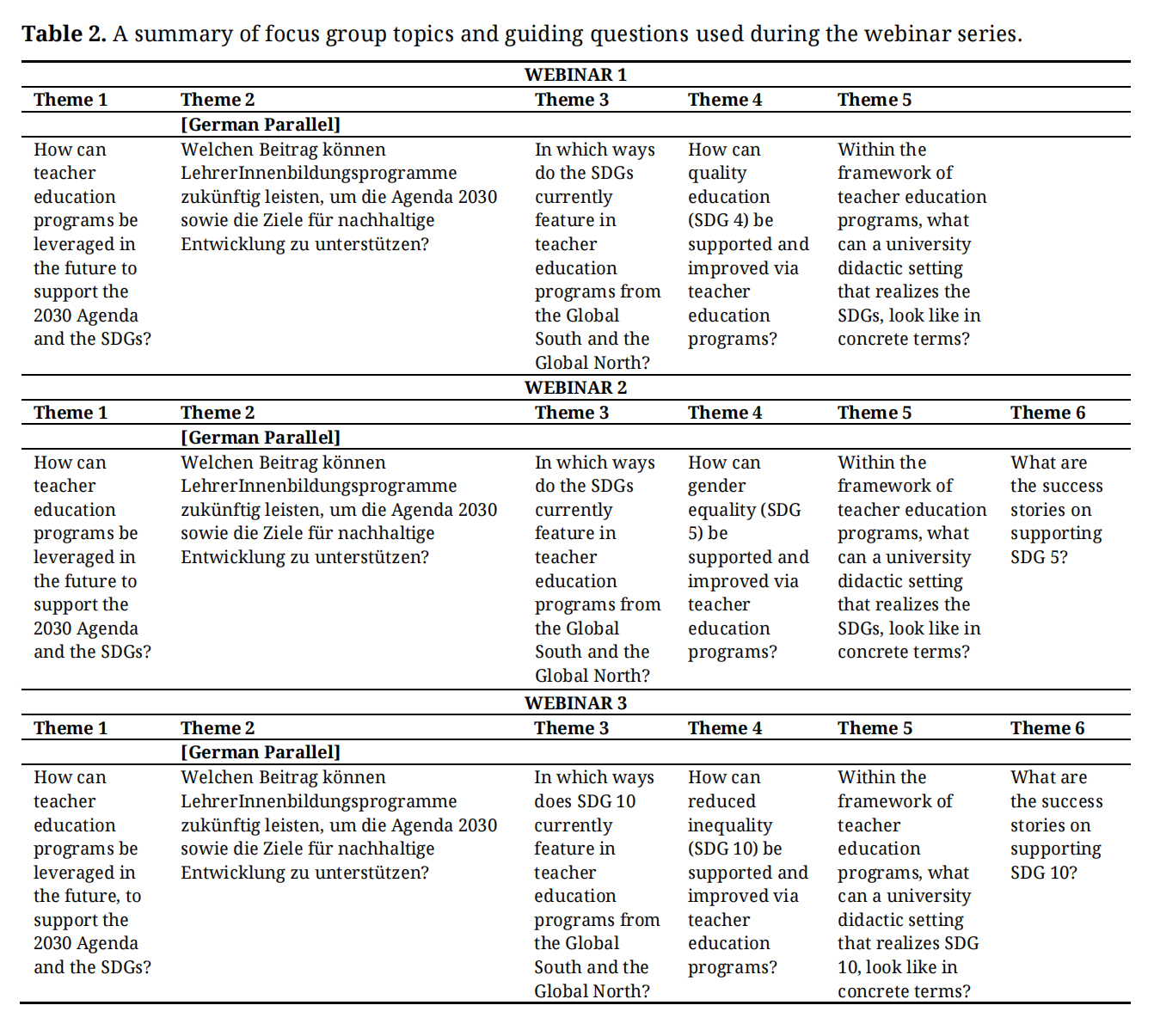 The current study (as part of the Teach4Reach 1.0 project) addressed the question of how education stakeholders from the Global North and the Global South conceptualize quality education in relation to sustainability—as introduced by the UN [1] during online webinars dealing with SDGs 4, 5 and 10. Due to societal changes and developments, it is important to focus on conceptions of quality education, especially in teacher education. This study was undertaken since conceptualizations of quality education are frequently vague or complex and do not necessarily go beyond the guidelines of the 2030 Agenda to “ensure inclusive and equitable quality education and promote lifelong learning opportunities for all” ([1], p.19).