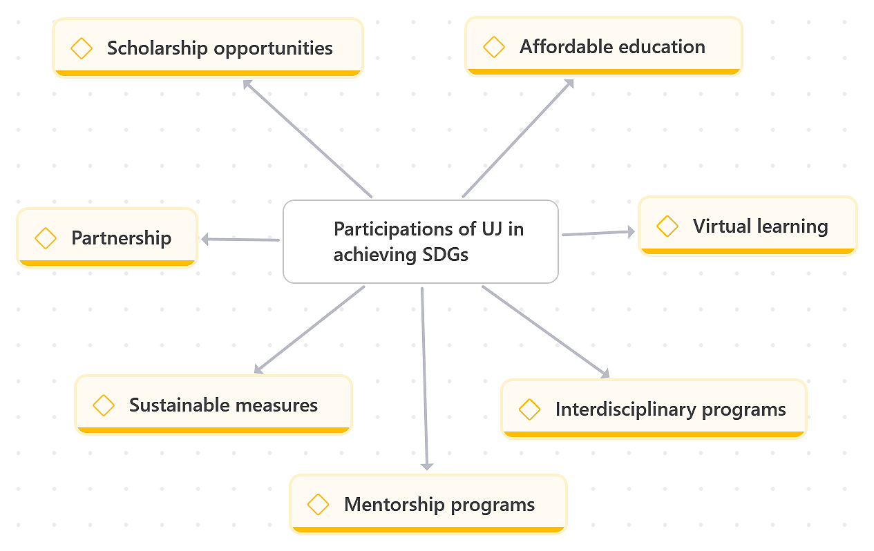 Participation in Achieving Sustainable Development GoalsThe stakeholders perceived UJ to have participated in achieving SDGs through scholarship opportunities, partnerships, affordable education, interdisciplinary programs, mentorship programs, virtual learning, and sustainable measures. Both staff and students expressed that UJ participated in achieving SDGs by promoting access to quality education through providing scholarship opportunities to less privileged students.
