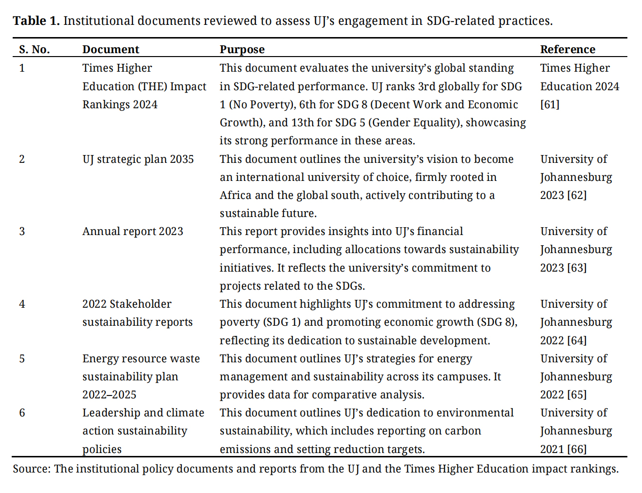 Data was collected through semi-structured interviews (primary data) with the participants to address the study problem and two research questions. The focus was on stakeholders’ perceptions of leadership roles in SDG-related university engagement, including students, lecturers, and administrative staff. To overcome language barriers, the researcher and a volunteer research assistant conducted the interviews, allowing participants to respond in their preferred South African languages while presenting questions in clear, concise English. Each participant demonstrated their command of the English language by responding in English. Interview recordings were transcribed verbatim and analyzed thematically using Atlas.ti version 22, categorizing responses into themes based on the research questions. In addition to the primary data analysis, an in-depth analysis of institutional policy documents, and supplementary quantitative data of the UJ with contextual reference was conducted to validate participant responses and triangulate findings. The following institutional documents were reviewed and are presented in Table 1.
