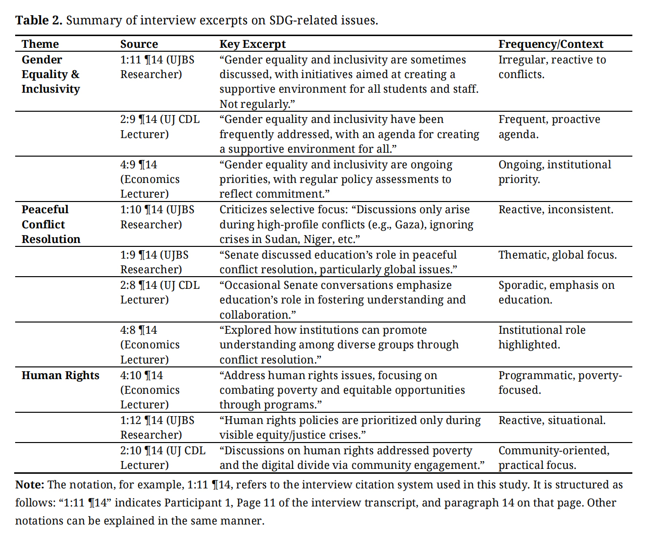 “The university is actively contributing to the SDGs through partnerships with local organizations that focus on education, health, and environmental sustainability”. Interview with a University of Johannesburg Business School (UJBS) Researcher.
