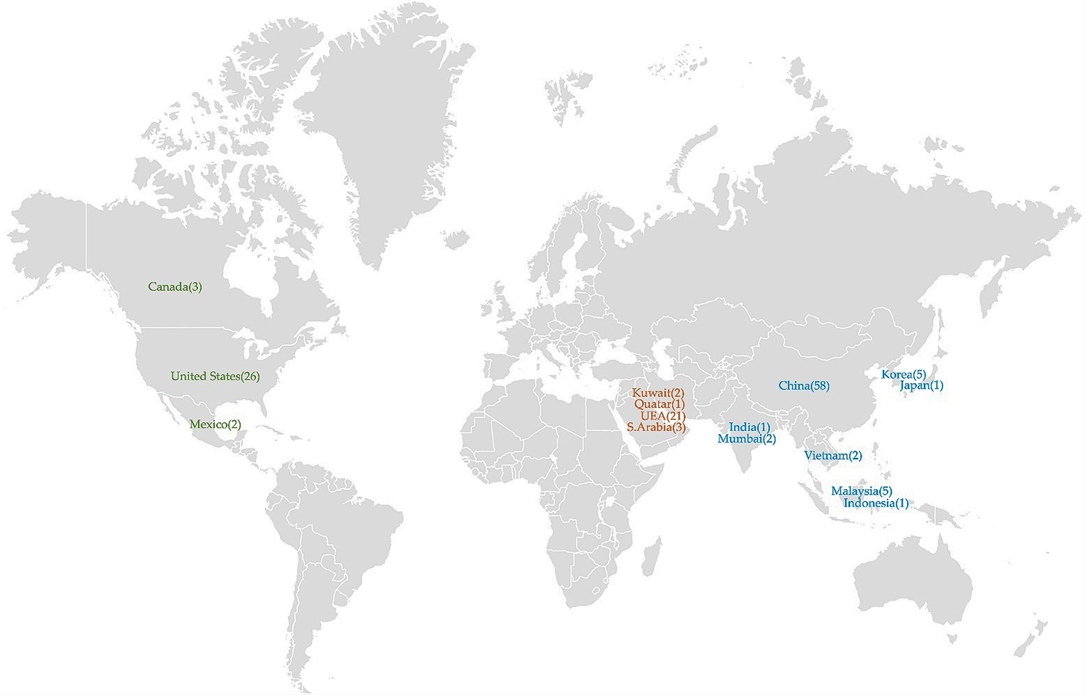 In this study, the case sample was meticulously curated to provide a robust and representative examination of 133 skyscrapers (27 from Middle East, 75 from Asia, and 31 from North America) with varied functional purposes worldwide. While geographical limitations and access restrictions shaped the selection, the chosen sample was thoughtfully assembled to deliver an in-depth analysis of architectural and structural features of skyscrapers. The sample encompasses a diverse array of skyscrapers, as depicted in Figure 1, offering a comprehensive perspective on design and efficiency in tall structures globally.