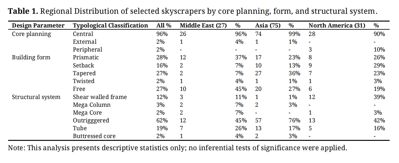 The methodological innovation of this research lies in its integration of architectural and structural parameters into a single comparative framework. Unlike many existing works that focus exclusively on either structural efficiency or formal aesthetics, this study recognizes the interdependence of form, structure, and function in high-rise design. Rather than relying on anecdotal or stylistic interpretation, it presents a systematic assessment of regional patterns based on measurable indicators such as function (residential, office, mixed-use), core type (central, external, peripheral), formal geometry (prismatic, tapered, freeform, etc.), and structural systems (outriggered frame, diagrid, mega-frame, etc.). This cross-tabulation across disciplines allows for a more holistic understanding of skyscraper typologies and responds directly to calls in the literature for more integrated approaches [39–41].