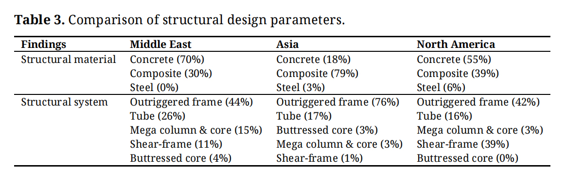 Main Structural Design ParametersThis section presents a comprehensive quantitative analysis of structural design parameters for a total of 133 skyscrapers in the Middle East (27 towers), Asia (75 towers), and North America (31 towers). The methodology involved multiplying the percentage values in Table 3 by the number of buildings in each region to produce the number of towers in each subcategory.