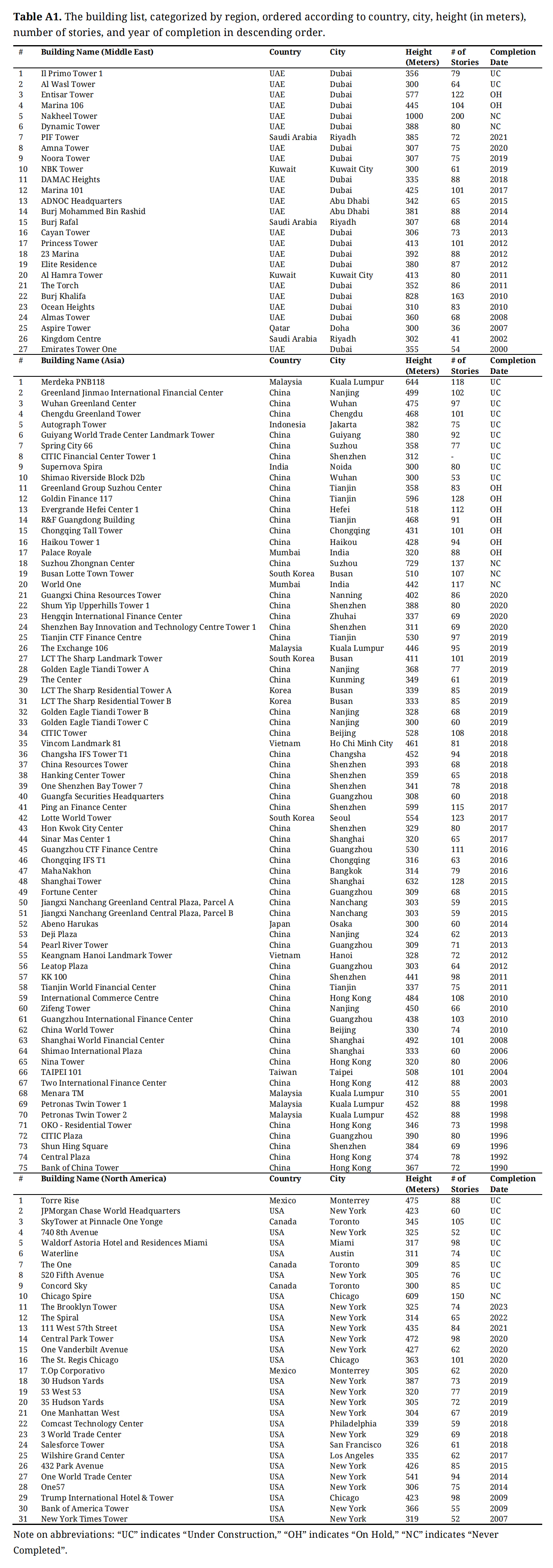 Skyscrapers are iconic representations of architectural ambition, technological prowess, and urban identity, embodying the rapid transformation of urban landscapes around the world [1–3]. Over recent decades, regions such as the Middle East [4], Asia [5], and North America [6] have emerged as distinct centers for skyscraper development, each marked by unique architectural patterns and structural innovations shaped by economic, cultural, and environmental forces. This comparative study explores the design evolution of skyscrapers within these three regions, providing insight into how localized priorities and challenges influence high-rise construction in complex and densely populated urban environments.