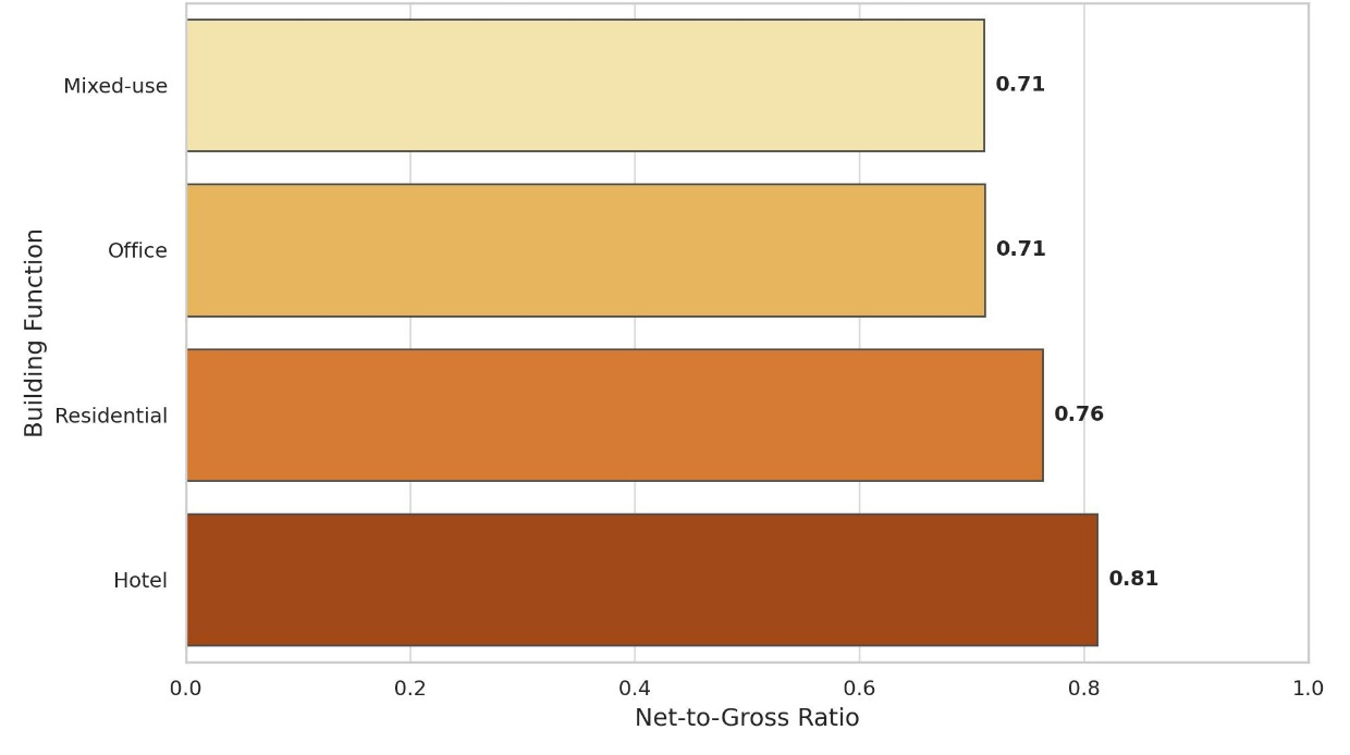 By contrast, mixed-use and office towers tend to underperform spatially, with average net-to-gross ratios falling below 72%. This is due to their inherently fragmented vertical zoning. Mixed-use buildings require duplicated service cores, transfer lobbies, intermediate mechanical zones, and separate vertical circulation systems for different functions, e.g., hotel, residential, office, or retail. These transitions introduce floor area inefficiencies that significantly reduce usable space. Offices, while monofunctional, demand flexible and open floorplates, deeper service zones, and larger cores to accommodate lift zoning, which adds to the non-net area burden.