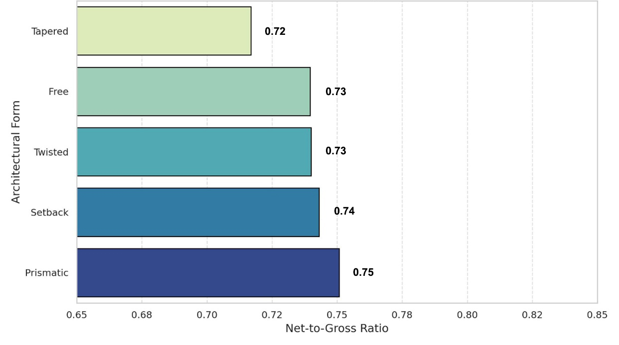 In contrast, office towers, particularly those with twisted (0.67) and prismatic (0.69) geometries, show comparatively lower net-to-gross ratios. This can be attributed to the increased service core demands, deeper floorplates, and diverse circulation systems required by office functions, which reduce usable floor area. Similarly, mixed-use configurations across all forms underperform relative to single-function counterparts, reinforcing the spatial cost of vertical programmatic mixing and duplicated service elements.