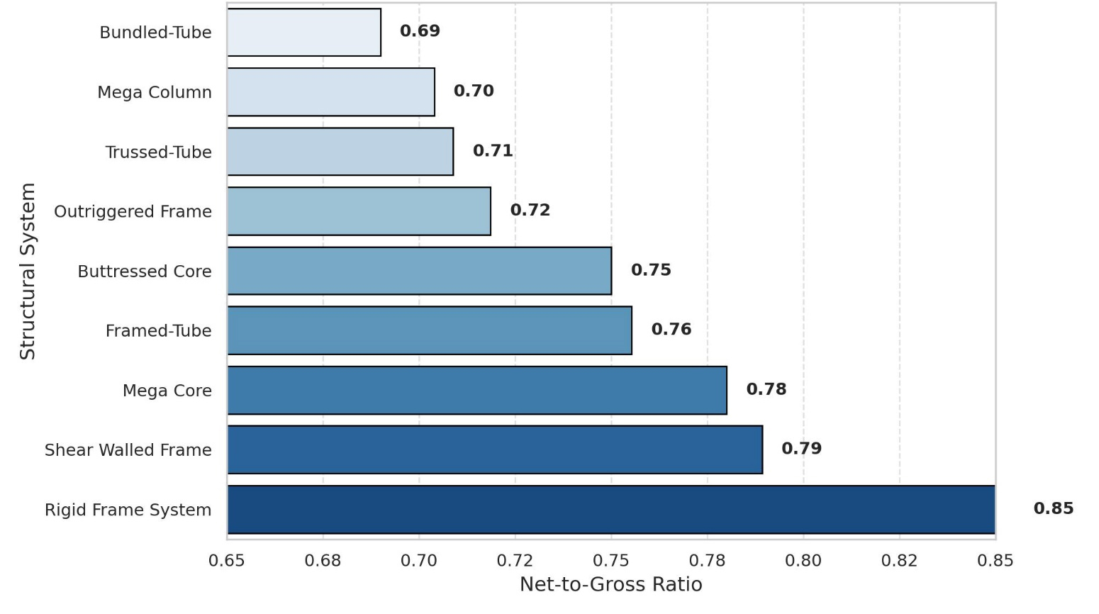 Conversely, structurally ambitious systems such as the Bundled-Tube (69%), Mega Column (70%), Trussed-Tube (71%), and Outriggered Frame (72%) displayed significantly lower net-to-gross performance. These systems are often employed in landmark towers requiring high stiffness-to-height ratios. However, they tend to introduce deep cores, perimeter stiffening, transfer decks, and belt trusses—all of which compromise net space. Ali and Moon [2] similarly concluded that structurally expressive but spatially disruptive systems—such as mega-columns or outrigger cores—impose a spatial penalty not always justified by performance. These spatial trade-offs, while sometimes necessary for structural or iconic reasons, emphasize the disconnect between engineering optimization and space economy.