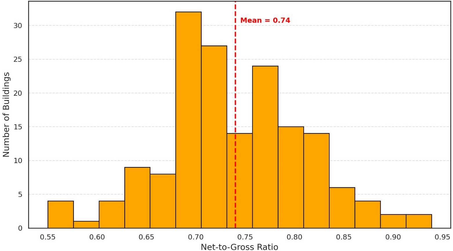 Notably, there is a tail of buildings exhibiting very high efficiency levels (above 0.85), likely corresponding to optimized residential or hotel towers with single-use programming and vertically repetitive cores. Conversely, a smaller proportion of buildings fall below 0.65, indicating either early-generation high-rises with oversized cores or complex mixed-use programs with redundant vertical services.