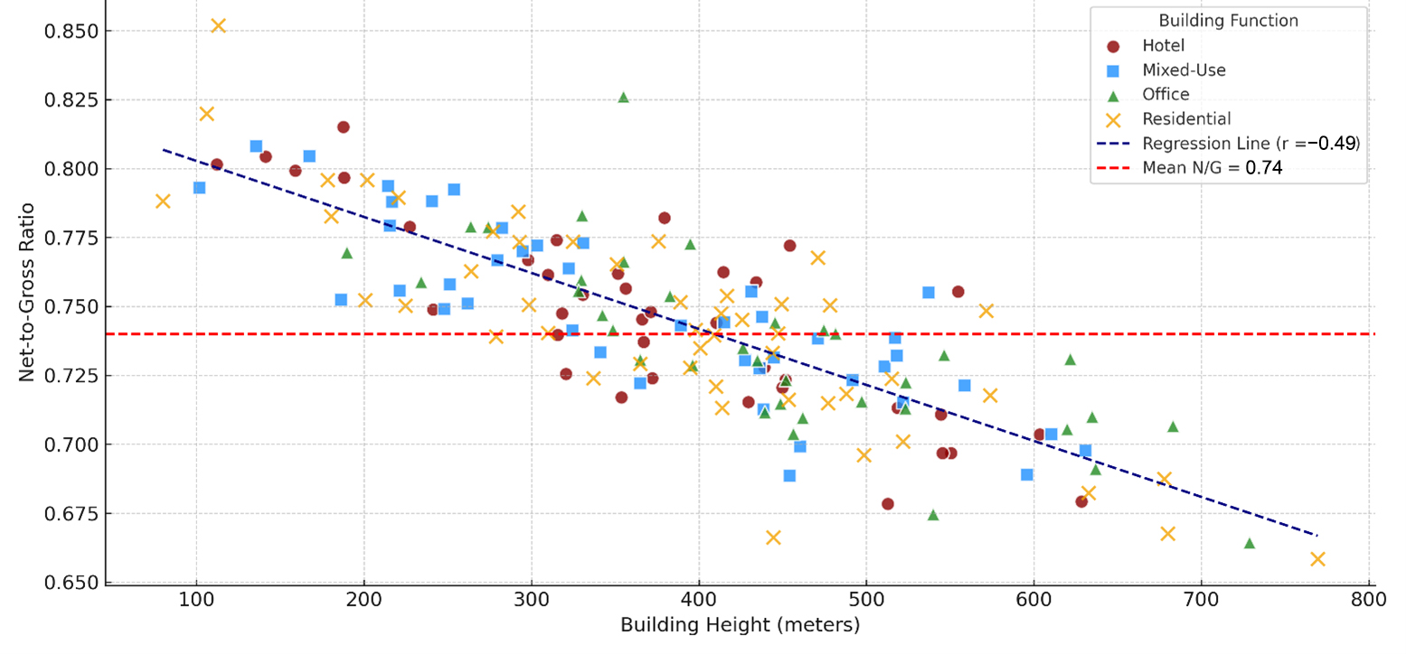 The regression model was applied to the entire sample of 166 buildings. All values of the net-to-gross ratio used in this analysis were either directly obtained from published sources or conservatively estimated from floorplans as described earlier. The results were visualized using a scatter plot (Figure 7), where each data point represents a unique tower and is color-coded by function to aid interpretation. It is important to note that this was a strictly bivariate regression, and no higher-order or multivariate statistical inferences were attempted.