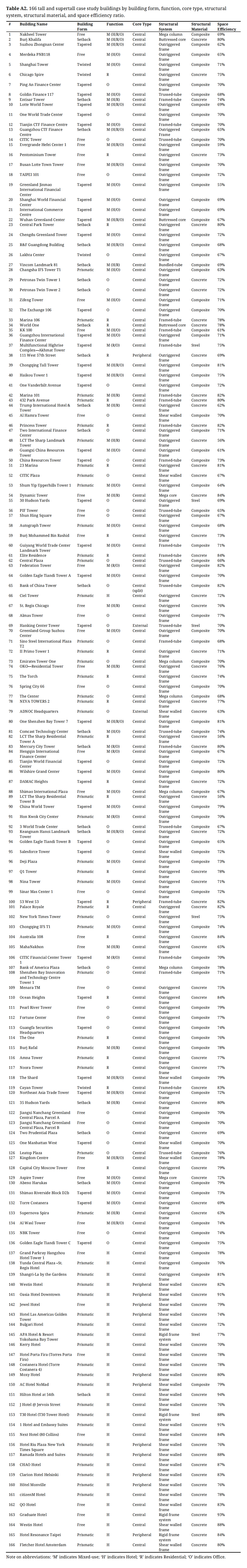 Table A2. 166 tall and supertall case study buildings by building form, function, core type, structural system, structural material, and space efficiency ratio.
