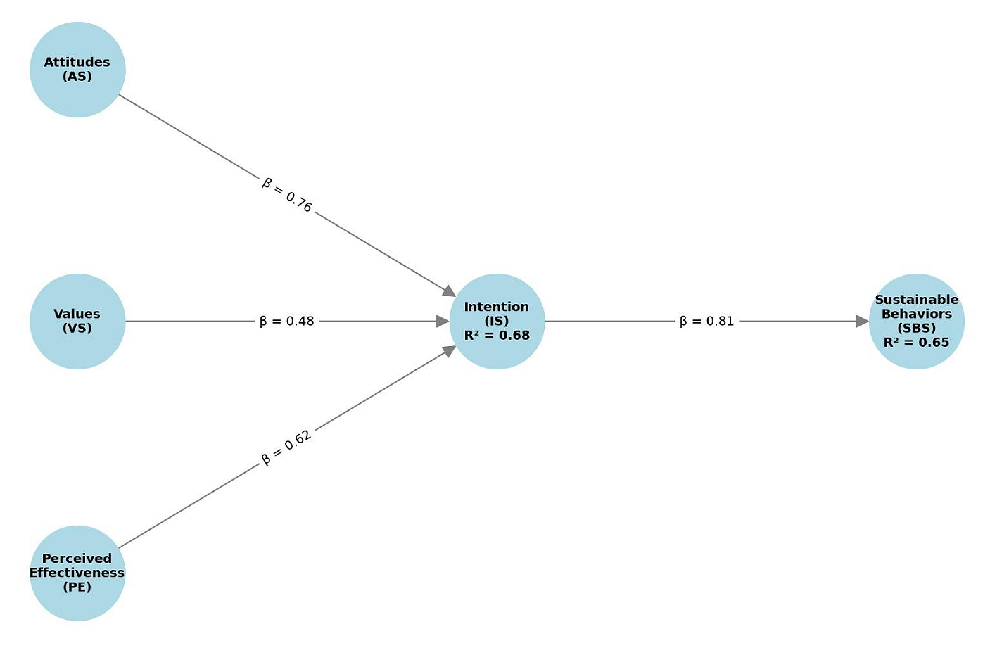 Figure 2. SEM Results. The SEM model illustrates the relationships between AS, VS, PE, IS, and SBS. Standardized path coefficients (β) are displayed along each arrow, with significance levels indicated (p < 0.001). The model explains 68% of the variance in Intention and 65% of the variance in Sustainable Behaviors, highlighting the central role of Intention in mediating the effects of Attitudes, Values, and Perceived Effectiveness on Sustainable Behaviors. Note: Structural equation model created by the authors based on the data collected in this study.
