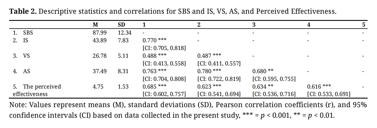 Relationship between Intention, Attitudes, Values, Perceived Effectiveness, and Sustainable BehaviorsTable 2 presents descriptive statistics and zero-order correlations for the SBS, the IS, the VS, the Attitudes Scale, and Perceived Effectiveness.
