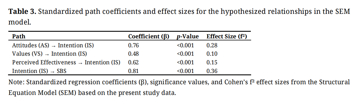 Figure 2 illustrates the full SEM path diagram. These findings underscore the central role of intention as a mediator connecting cognitive and motivational antecedents—attitudes, values, and perceived effectiveness—with sustainable behavior. The high variance explained in both intention and behavior supports the theoretical model, suggesting that interventions targeting these psychological factors may enhance pro-environmental intentions and actions.