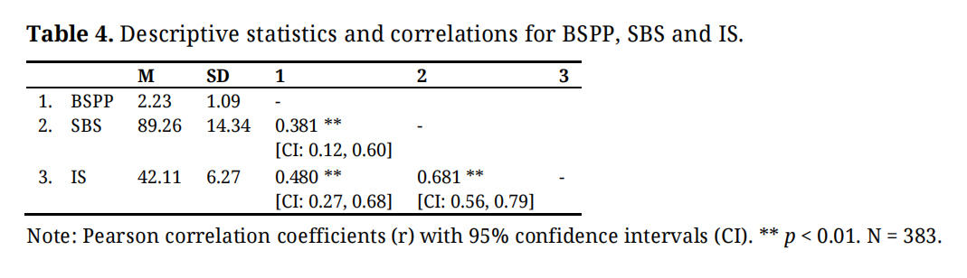 Relationship between Intention, Self-Reported Behavior, and Observed Sustainable Behavior (BSPP)Table 4 presents descriptive statistics and bivariate correlations between the BSPP, the SBS, and the IS.