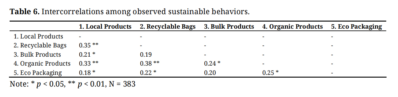 To further explore behavioral patterns, we examined the intercorrelations among the five observed sustainable actions (Table 6). Several positive associations emerged, suggesting that certain behaviors tend to co-occur. For example, using recyclable bags was moderately associated with purchasing organic products (r = 0.38, p < 0.01) and locally sourced products (r = 0.35, p < 0.01), indicating that these behaviors may reflect a broader ecological mindset or shared situational opportunities (e.g., product visibility or store layout). Bulk purchases, on the other hand, showed weaker and more inconsistent associations, possibly due to their higher effort or logistical complexity. The weakest correlations were observed between eco-friendly packaging and other behaviors, reinforcing the idea that some sustainable actions—especially those requiring effortful planning or facing availability constraints—may remain isolated choices rather than part of a habitual behavioral cluster. These results suggest that sustainable behaviors do not always emerge as a unified pattern, underscoring the importance of designing interventions that target behavior-specific facilitators and barriers.