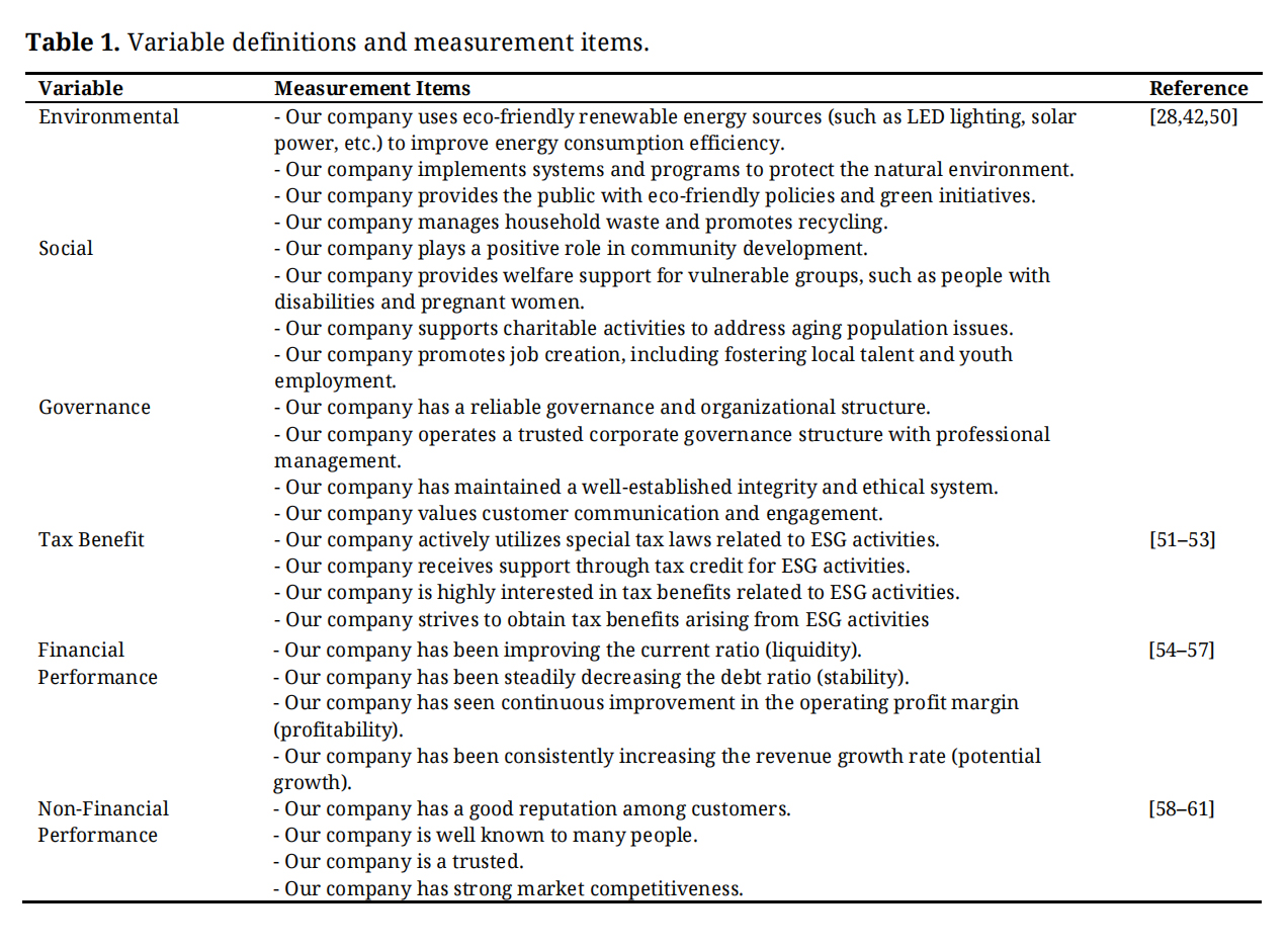 Measurement Variable and Data CollectionIn this study, ‘environment’ means the various eco-friendly corporate activities with the aim of improving performance. ‘Society’ refers to corporate social responsibility activities for guaranteeing labor rights, promoting gender equality, providing a safe working environment, contributing to local communities, and protecting human rights. ‘Governance’ refers to establishing and maintaining a fair and transparent corporate governance system by emphasizing transparency and accountability in management decision-making processes. ‘Tax benefit’ refers to various preferential tax measures provided by the government to minimize the tax burden on certain taxpayers, whether individual or corporate. ‘Corporate performance’ refers to financial performance such as growth and profitability, and non-financial performance such as corporate reputation, trust, and market competitiveness.