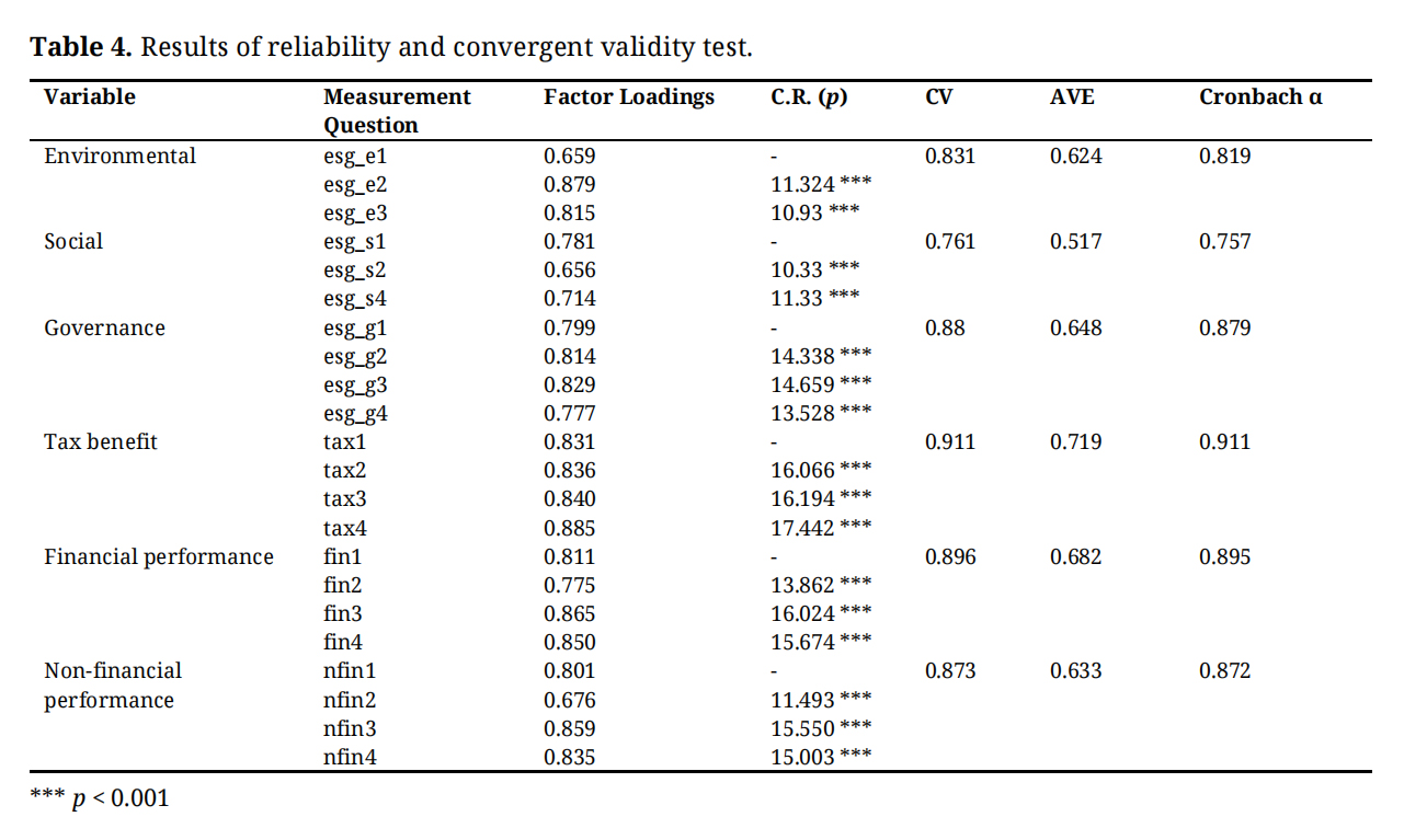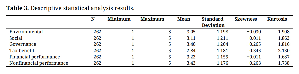 Analysis Results of Reliability and ValidityDescriptive statistical analysis of variables was conducted (see Table 3). First, the average of the ESG environment was found to be 3.05 with a standard deviation of 1.198. The average of ESG social contribution was found to be 3.11 with a standard deviation of 1.211. The average of ESG governance was found to be 3.40 with a standard deviation of 1.204. The average of tax incentives was found to be 2.84 with a standard deviation of 1.181. The average of financial corporate performance was found to be 1.155. The average of non-financial corporate performance was found to be 3.43 with a standard deviation of 1.176. Skewness and kurtosis were used to confirm the normality of the data. As a result of the analysis, it was analyzed that the univariate normality assumption, in which skewness never exceeded 3 and kurtosis never exceeded 8, was valid.