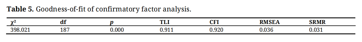 The goodness-of-fit analysis of the structural equation model revealed a χ² of 398.021. The Comparative Fit Index (CFI) value was 0.920, and the Tucker-Lewis Index (TLI) value was 0.911, both of which were significant at levels above 0.9. The Root-Mean-Square Error of Approximation (RMSEA) value of 0.036 and the Standardized Root-Mean-Square Residual (SRMR) value of 0.031, both of which were significant below 0.1, indicated that the measurement model fit the constructs statistically significantly (see Table 5).