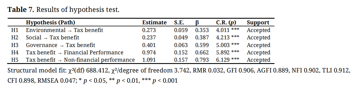 Analysis Results of Structural ModelThe goodness-of-fit of the structural model was analyzed (see Table 7), and the resulting χ² (df) value was 688.412, with a corresponding χ² degree-of-freedom value of 3.742. The model demonstrated satisfactory performance, with a Goodness-of-Fit Index (GFI) of 0.906 and a Normal Fit Index (NFI) of 0.902. The Root-Mean-Square Residual (RMR) was 0.032, the Adjusted Goodness-of-Fit Index (AGFI) was 0.889, and the RMSEA was 0.047, indicating that the model’s goodness-of-fit was significant. The CFI, which indicates the explanatory power of the model without being affected by the sample, was 0.898, and the TLI, which determines the explanatory power of the structural model, was 0.121. These values indicate that the basic model was a good fit. Hypothesis testing was conducted through path analysis of the structural equation model, which resulted in the acceptance of the five hypotheses. ESG Environmental had a positive effect on tax benefits (4.011, p < 0.001) and ESG Social Contribution had a positive effect on tax benefits (4.213, p < 0.001) and ESG Governance had a positive effect on tax benefits (5.003, p < 0.001). Tax benefits had a positive effect on financial corporate performance (5.892, p < 0.001) and non-financial performance (6.129, p < 0.001).