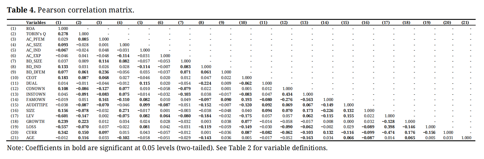 Table 3 presents the descriptive statistics of the research variables. The ROA index has an average of 0.127 and a median of 0.110. Additionally, the average Tobin’s Q index is 2.360. The average percentage of female members on the audit committee is 0.042, while 0.131 of the audit committees in firms listed on the TSE have at least one female member. The average size of the audit committee is 3.158 members, with a minimum of 3 and a maximum of 5. The results indicate that 0.714 of the audit committee members are independent. Furthermore, an average of 0.837 committee members have financial expertise. The average number of board members is 5.042, of whom 0.664 are independent, and only 0.089 are women. The results also show that the average CEO tenure in Iranian firms is 2.971 years, while 0.306 of CEOs also serve as the chairman of the board of directors. Regarding ownership structure, the average ownership concentration, institutional ownership, and family ownership are 0.720, 0.568, and 0.119, respectively. Approximately 0.179 of the sample firms are audited by large audit firms. Additionally, the average firm size is 14.457, the average debt ratio is 0.565, and the average growth rate is 0.303. Lastly, 0.113 of the firms have reported financial losses.