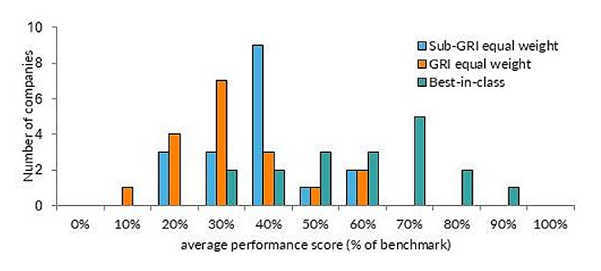We also find evidence of selective behavior within sub-environmental themes. Among Emissions (GRI 305), sub-GRI 305-7, which covers Nitrogen oxides (NOx), Sulphur oxides (SOx), and other significant air emissions, records the highest average score across the sample, (69.8% of the benchmark score). Reporting requirements for sub-GRI 305-7 are more standardized across sectors, using similar table formats for NOx, SOx, and other particle emissions, leading to more comparable and available data. Other Emissions sub-themes score relatively high against the benchmark, namely scope 2 emissions (305-2: 55.6%), carbon intensity (305-4: 55.2%), reduction of greenhouse gas (305-5: 50.0%), and scope 1 emissions (305-1: 44.2%).