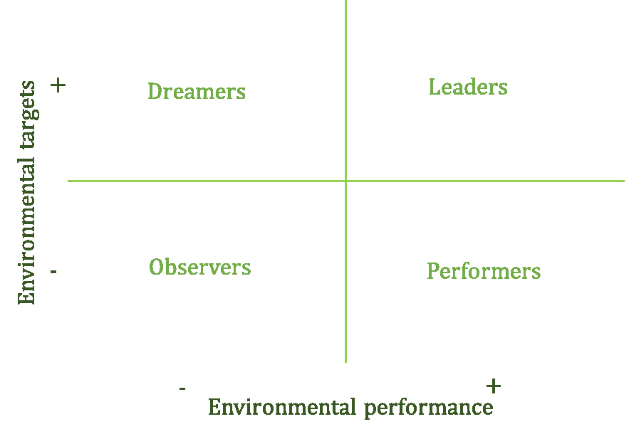 An Evaluative Framework for True SustainabilityWe propose an evaluative framework for true sustainability grounded in empirical evidence from the scoring method, which simultaneously evaluates firms’ environmental performance and environmental target setting. These two pillars represent complementary yet distinct aspects of true sustainability: one captures the effectiveness of past and current environmental actions, while the other reflects the strategic orientation toward future improvement. The intersection of these two variables provides an empirically meaningful basis for classifying companies into four true sustainability profiles (Figure 6). Leaders, Performers, Dreamers, and Observers—each reflecting a different balance between realized environmental outcomes and forward-looking commitments. Leaders demonstrate both high environmental performance and ambitious targets, reflecting robust current practices and a commitment to future improvement. Performers achieve strong environmental outcomes yet lack ambitious targets, indicating steady progress without substantial forward-looking goals. In contrast, Dreamers set high targets but exhibit weak current performance, highlighting a gap between aspiration and action. Lastly, Observers score low in both dimensions, showing minimal engagement with true sustainability practices.