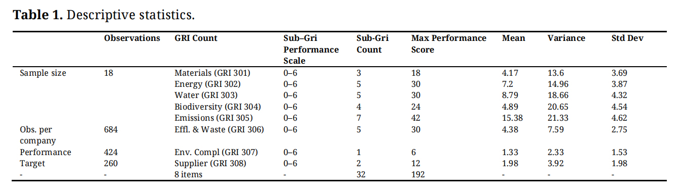 Data Compilation and CodingIn the second step, we compiled and analyzed data from the corporate sustainability reports, including supplementary sections, summaries, and appendices. This process was tedious since the reports were complex and lengthy, given that GRI disclosure lacks a standardized structure, with companies reporting in varying sequences, or through case studies or best practices. Occasionally, the GRI and sub-GRI headings were missing or data was reported without specifying the corresponding GRI, further complicating the process of data extraction and coding. Data compilation and categorization were carried out independently by the three researchers. To ensure consistency and reliability, we triangulated by randomly reassigning companies to coders, allowing for cross-validation of the categorizations. The coders attained an agreement in excess of 90%. Any discrepancies in criteria were resolved collaboratively, and coding was updated accordingly. This process yielded 144 observations at the GRI level and 576 at the sub-GRI level. After removing missing data, we compiled 684 observations per company, consisting of 424 environmental performance items and 260 environmental target items. In total, the sample includes 12,312 observations (684 per company × 18 companies). Table 1 presents the descriptive statistics.