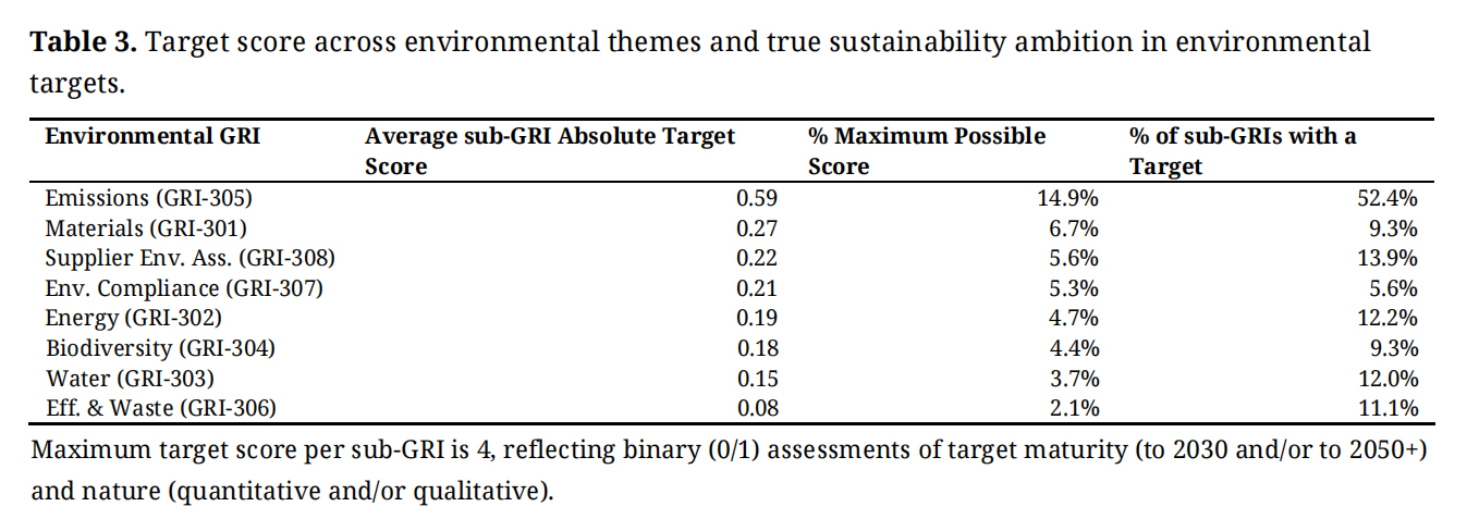 We find evidence of selective behavior and limited ambition in target setting. As shown in Table 3, companies set targets for only 5.6% to 13.9% of the sub-environmental themes, except for emissions (GRI-305), where targets cover 52.4% of its sub-themes (i.e., scope 1, 2, and 3 emissions). This suggests that the average target score is driven by a narrow focus on specific sub-GRIs, rather than a broader, more ambitious approach. The current emphasis on science-based targets [71], which prioritize emission reduction targets, may explain this pattern. However, such selective practice might not be sufficient to approach true sustainability, which demands comprehensive and ambitious targets across all environmental themes. Thus, the high degree of selectivity and lack of ambition towards true sustainability observed in the environmental performance is also present for target setting.