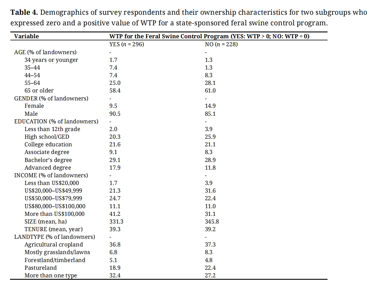 Table 4. Demographics of survey respondents and their ownership characteristics for two subgroups who expressed zero and a positive value of WTP for a state-sponsored feral swine control program.